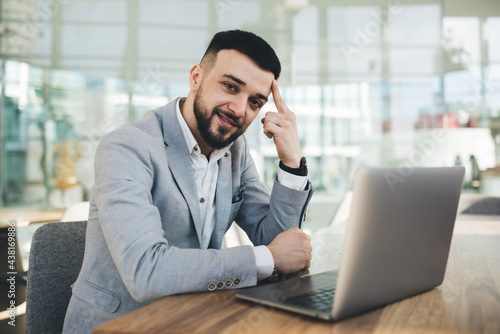 Content businessman working on laptop and touching forehead
