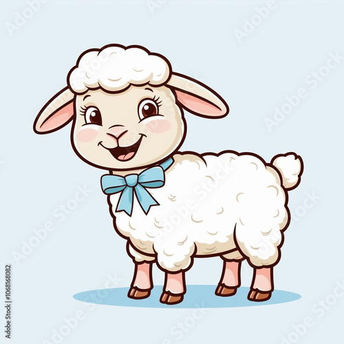 Contented lamb with tiny blue bow, soft wooly texture, cartoonish style, cheerful expression, white background, adorable character