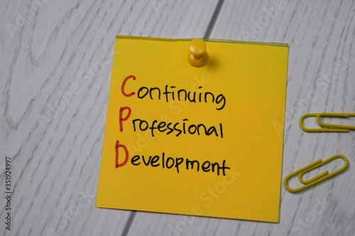 Continuing Professional Development write on sticky note isolated on wooden table.