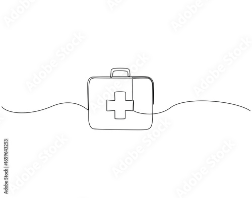 Continuous line drawing of first aid kit box. Single line illustration of medical box container. Medical equipment concept. Editable outline