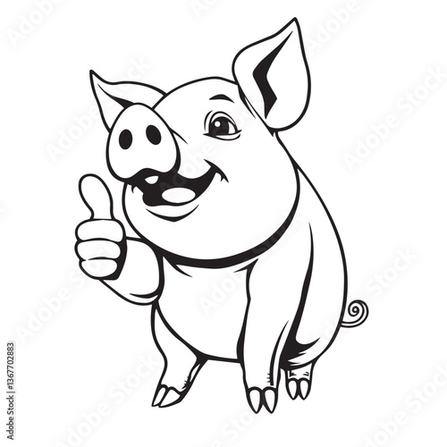 Continuous one black line art drawing a pig giving a thumbs up design vector.