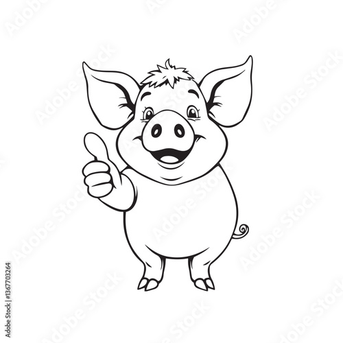 Continuous one black line art drawing a pig giving a thumbs up design vector.
