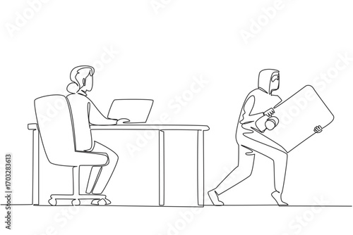 Continuous one line drawing grandma typing on laptop and thief taking credit card from behind screen. Hacking. Data. National Senior Fraud Awareness Day. Single line draw design vector illustration