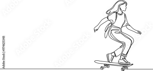 continuous single line drawing of teenage girl on skateboard, line art vector illustration