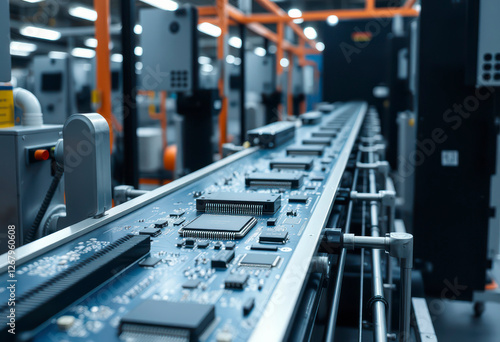 Conveyor system transports printed circuit boards with advanced processing units at an electronics factory during operational hours.