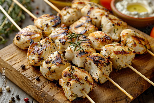 Cooked chicken skewers with spicy sticky glaze on wooden cutting board