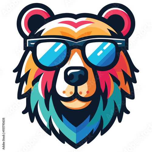 Cool bear illustration wearing sunglasses trendy multicolor isolated on white background