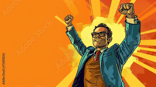 cool looking happy businessman throwing fists to the sky in colorful comic illustration style. Copyspace for text.