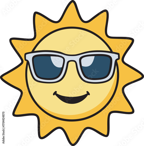Cool smiling sun character wearing sunglasses bright yellow warm summer day
