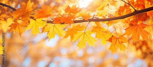 Copy space image featuring vibrant close-up autumn foliage in golden-yellow, orange, and red hues, set against a blurred background with sunlight, ideal for fall-themed designs.