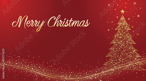 copy space, luxury happy merry christmas card with golden glitter line drawing of an elegant christmas tree, red background, text " Merry Christmas". Christmas greeting card, elegant, expensive design