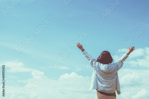 Copy space of woman rising hands on blue sky white clouds abstract background. Freedom feel good and travel adventure concept.