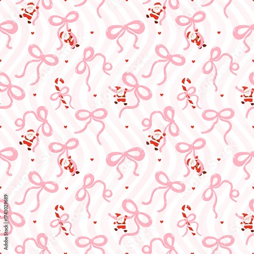 Coquette Christmas Pattern, Santa with Bows Seamless Festive Wallpaper Texture, Christmas Bows bakcground