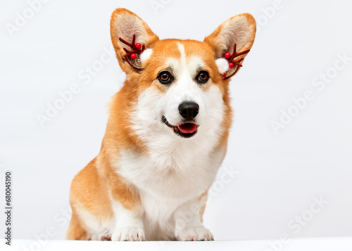Corgi dog in New Year's deer antlers on a white background