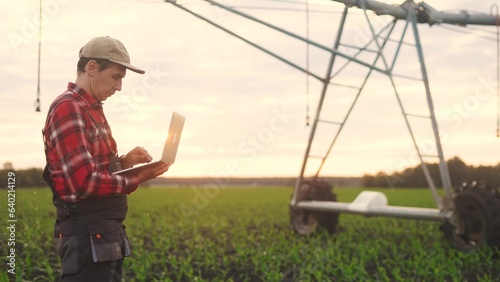 corn irrigation. a male farmer works on a laptop in a corn field. irrigation corn business concept. scientist studies growth and development of agricultural plants lifestyle using example of corn