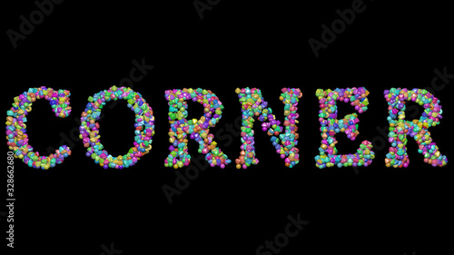 CORNER: 3D illustration of the text made of small objects over a black background with shadows
