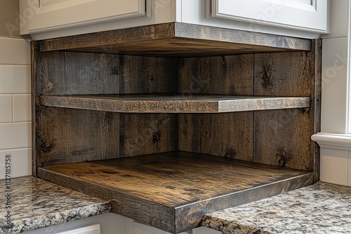 Corner kitchen shelves with dark wood finish and granite countertop.