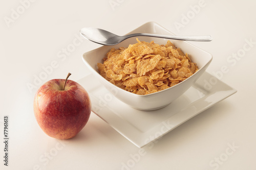 cornflakes in bowl with red apple on white background