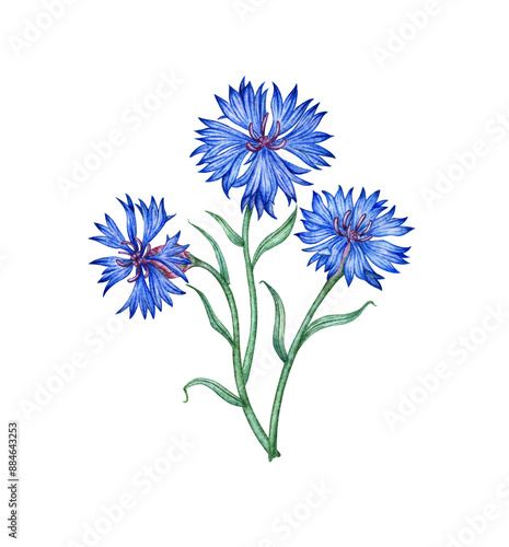 Cornflowers three blue flowers bouquet watercolor illustration. Botanical composition element isolated from background. Suitable for cosmetics, aromatherapy, medicine, treatment, care, design,