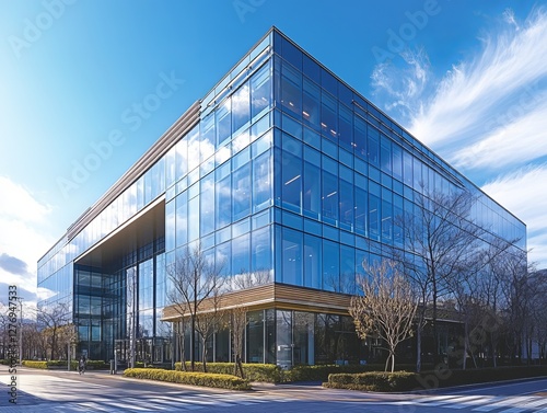 corporate building reflecting blue sky symbol of corporate success clean aesthetics