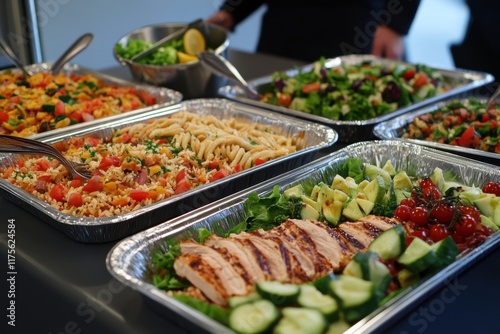 corporate catering services, a professional setting with neatly arranged trays of food and beverages for a corporate meeting or event