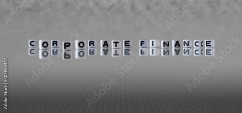 corporate finance word or concept represented by black and white letter cubes on a grey horizon background stretching to infinity