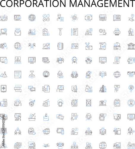 Corporation management outline icons collection. Corporating, Management, Strategy, Oversight, Administration, Regulation, Finance vector illustration set. Planning, Systems, Structuring linear signs