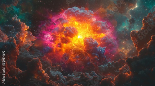 Cosmic explosion event outer space digital art colorful clouds wide angle celestial phenomenon