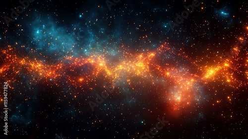 Cosmic nebula with orange and blue glowing gas clouds in space.
