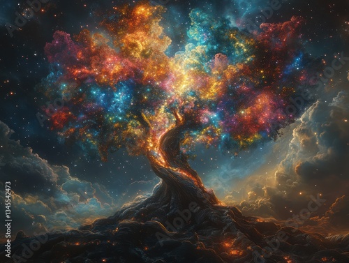 Cosmic Tree, vibrant nebula, night sky, fantasy art, design