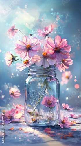 Cosmos in a Glass Mason Jar, Shabby Chic Style, AI generated illustration
