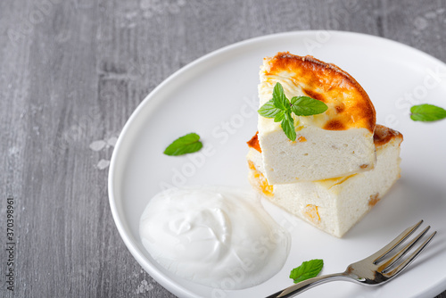 Cottage cheese casserole with raisins and semolina on wooden grey background. Cottage cheese casserole.