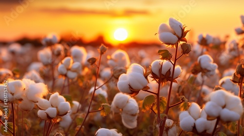 Cotton Buds in the Field a?" A serene landscape with cotton buds blooming in a golden-lit cotton field, gently swaying in the breeze at sunset.