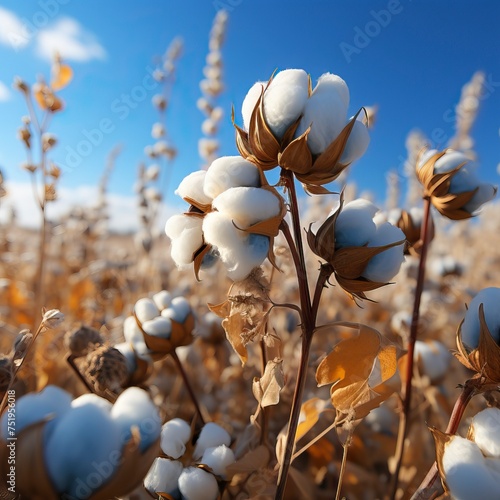 Cotton in a field with a blue sky in the style of gentle flower