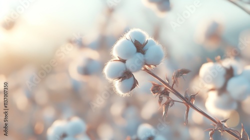 Cotton plants glow under the soft morning sunlight in a field, with fluffy bolls ready for harvest. The light creates a warm, tranquil mood, emphasizing the beauty of the cotton against the hazy