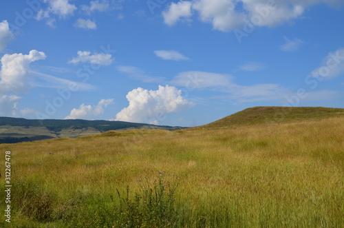 Countryside. White fluffy clouds against the blue sky. A field of green grass on a Sunny day.