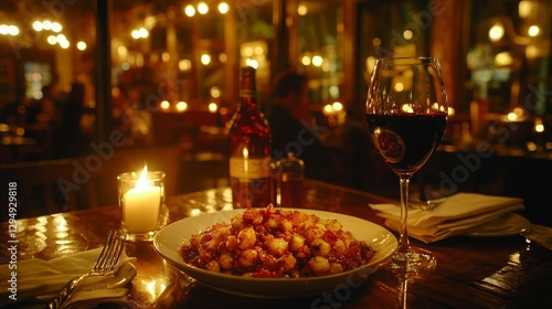 Couple enjoys intimate dining experience featuring beautifully plated gourmet dish accompanied glass of red wine in cozy candlelit restaurant setting.