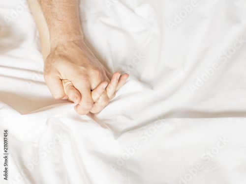 couple hands pulling white sheets in ecstasy, orgasm. Concept of passion. Oorgasm. Erotic moments. Intimate concept. Sex couple. Bedroom. Hotel room. Spa. Vacation.