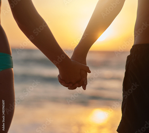 Couple, holding hands and together by ocean with love on tropical vacation, romantic getaway and journey for travel adventure. Man, woman and beach in Maldives for holiday, commitment and support.
