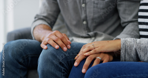 Couple, holding hands or sofa with empathy for love, care or commitment together at home. Closeup, man and woman with sympathy for bonding, cherish or support in comfort on living room couch at house