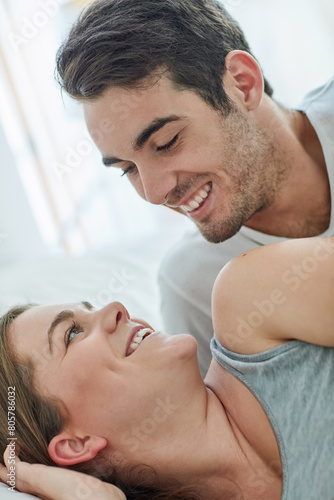 Couple, house and smile in ned and together for bonding, love or happy for relationship. Man, woman and bedroom with happiness for relax with trust, vacation or holiday with partner in Paris