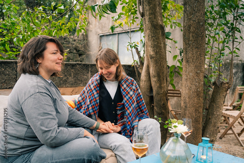 Couple Laughing and Relaxing Outdoors in a Cozy Setting