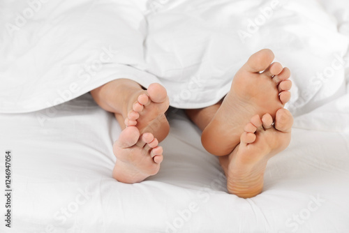 Couple lying in bed with white sheets, closeup