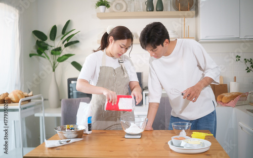 Couple preparing to bake together in a bright kitchen, woman measuring flour while man watches with whisk in hand. Concept of teamwork and home cooking.