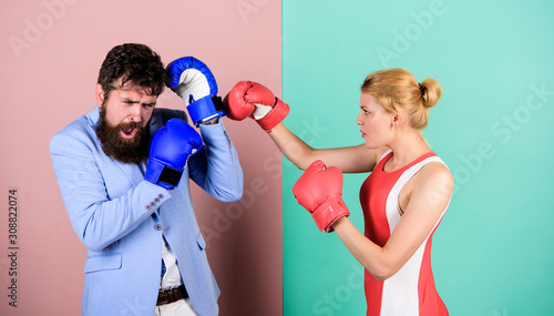 Couple romantic relationships. Man and woman boxing fight. Boxers fighting gloves. Conflict concept. Family life. Complicated relationships. Difficult relationships. Couple in love competing boxing