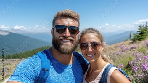 Couple selfie on mountaintop. Smiling hikers enjoying scenic view