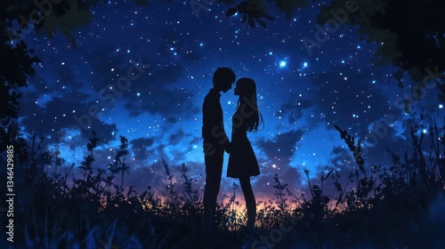Couple Silhouette Kissing Night Sky Field Romance