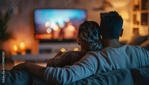 Couple spending time at home sitting on couch and watching TV
