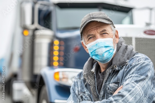Covid Truck. American Truck Driver Wearing Protective Face Mask in Transportation Industry