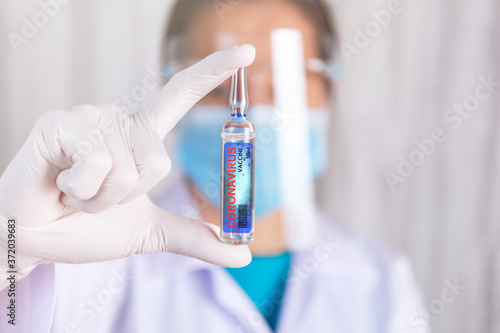 Covid-19 coronavirus vaccine. Close up hands of scientist show Covid-19 vaccine in glass vial. Hands of doctor wear latex glove holding Covid-19 vaccine in glass vial. Healthcare and medical concept.